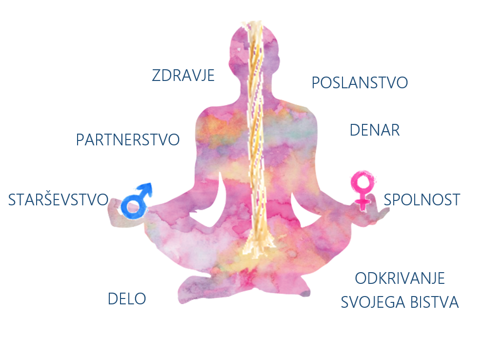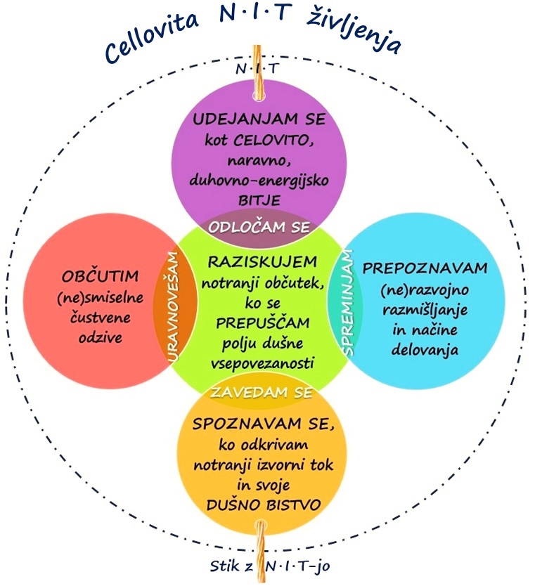 V spodnji shemi v PETIH KROGIH na poenostavljen način predstavljava, s čim se boš na usposabljanju seznanjal/-a in tako osvajal/-a vlogo in pomen posamezne ravni svojega ustroja (telesne – oranžen krog, psihične – rdeč in moder krog, duševne – zelen krog in duhovne – vijoličen krog). Bolj kot si sposoben/-na čutiti svojo notranjost na energijski ravni in biti povezan/-a z N·I·T-jo življenja, lažje zavestno preurejaš stanja v psihi. N·I·T je za celostno čutenje in razumevanje človeške zgradbe izjemnega pomena, saj z njeno pomočjo uravnovešaš delovanje na vseh ravneh.